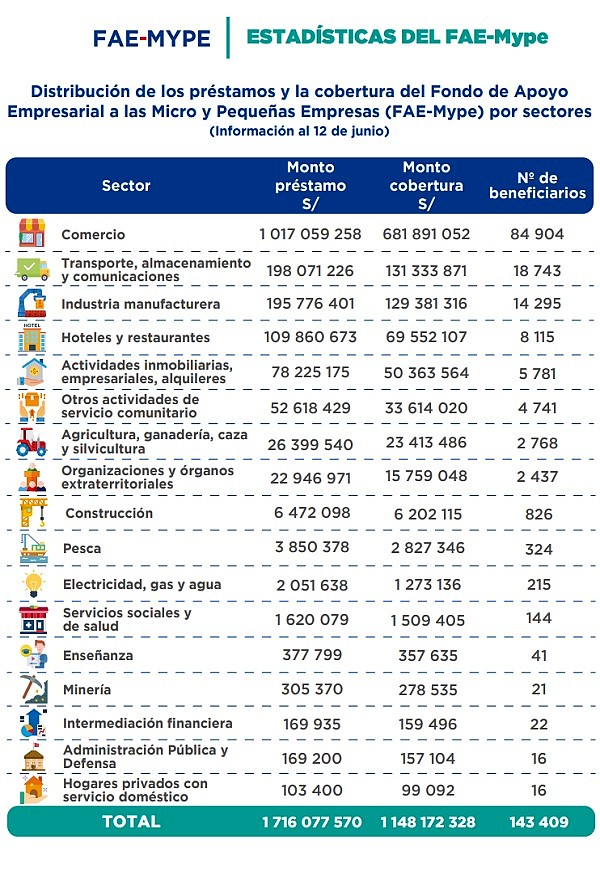 En el marco del FAE-Mype, se colocaron créditos por un monto mayor a S/ 1,716 millones, con un monto de cobertura de la garantía por S/ 1,148 millones, siendo el sector comercio el que demandó más créditos; seguido por el de transporte, almacenamiento y comunicaciones; y, la industria manufacturera. El fondo también brindó cobertura a empresas de los rubros como hoteles y restaurantes, actividades inmobiliarias, agricultura y ganadería, pesca, enseñanza, servicios sociales y de salud, etc.