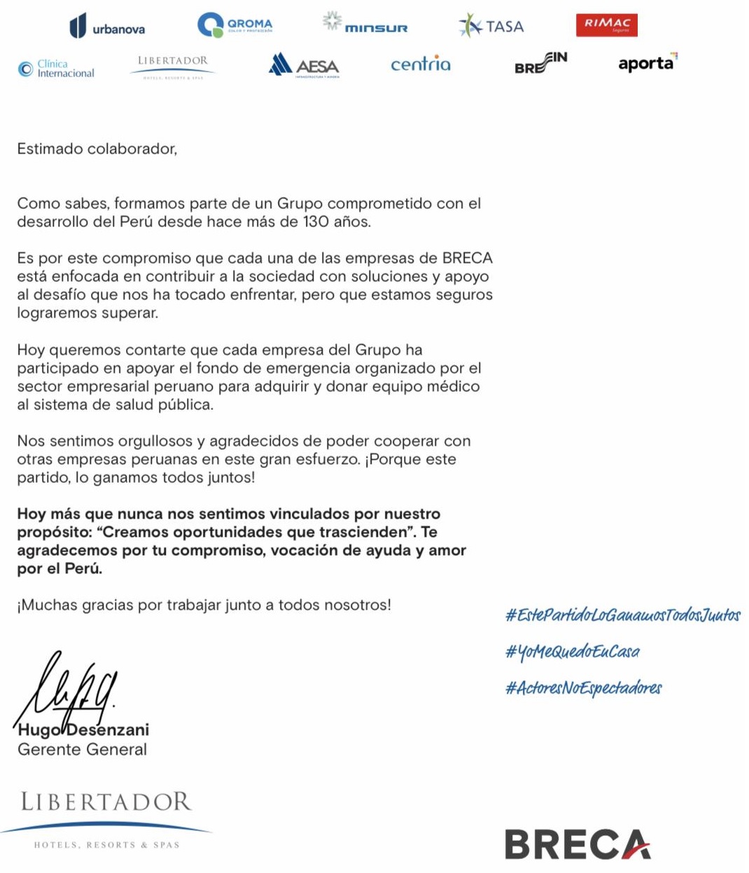 FELICITACIONES para Libertador Hoteles y otras empresas del GRUPO BRECA por apoyar a los más necesitados PARTICIPANDO enel FONDO DE EMERGENCIA que ha creado el SECTOR EMPRESARIAL para ayudar a los más desfavorecidos durante esta cuarentena, que ha sido prolongada hasta 12 de abril 2020