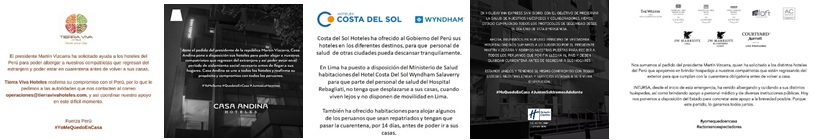 Durante estos 7 días hemos ido publicando y compartiendo información sobre las medidas que han ido tomando algunas de las cadenas hoteleras y hoteles del Perú y que han compartido en sus redes sociales o nos han informado directamente. Con esto no queremos decir que sean las únicas, son las que hemos podido identificar.
