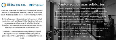 Costa del Sol Hoteles también dispuso sus hoteles en diferentes destinos del Perú para que los miembros del personal de salud puedan descansar luego de sus largos turnos de trabajo. Además, ha ofrecido al Ministerio de Salud habitaciones del Hotel Costa del Sol Wyndham Salaverry para albergar a parte del personal de salud del Hospital Rebagliati.