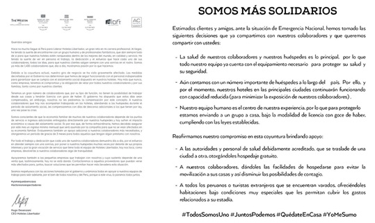 Desde Hotel Perú News FELICITAMOS TODAS ESTAS INICIATIVAS y mostramos nuestro apoyo al sector hotelero. A la vez nos ponemos a disposición de otros hoteles o cadenas del país que estén tomando este tipo de acciones u otras similares si desean hacerlas publicas que envíen un email a con la información a info@hotevia.info para poder hacernos eco de las medidas tomadas.