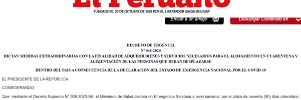 DECRETO DE URGENCIA Nº 048-2020 DICTAN MEDIDAS EXTRAORDINARIAS CON LA FINALIDAD DE ADQUIRIR BIENES Y SERVICIOS NECESARIOS PARA EL ALOJAMIENTO EN CUARENTENA Y ALIMENTACIÓN DE LAS PERSONAS QUE DEBAN DESPLAZARSE DENTRO DEL PAÍS A CONSECUENCIA DE LA DECLARACIÓN DEL ESTADO DE EMERGENCIA NACIONAL POR EL COVID-19 EL PRESIDENTE DE LA REPÚBLICA CONSIDERANDO: Que, mediante el Decreto … Sigue leyendo DECRETO DE URGENCIA: S/ 7 500 000,00 para adquirir bienes y servicios necesarios para alojamiento en cuarentena