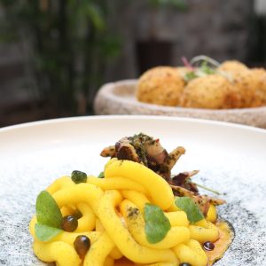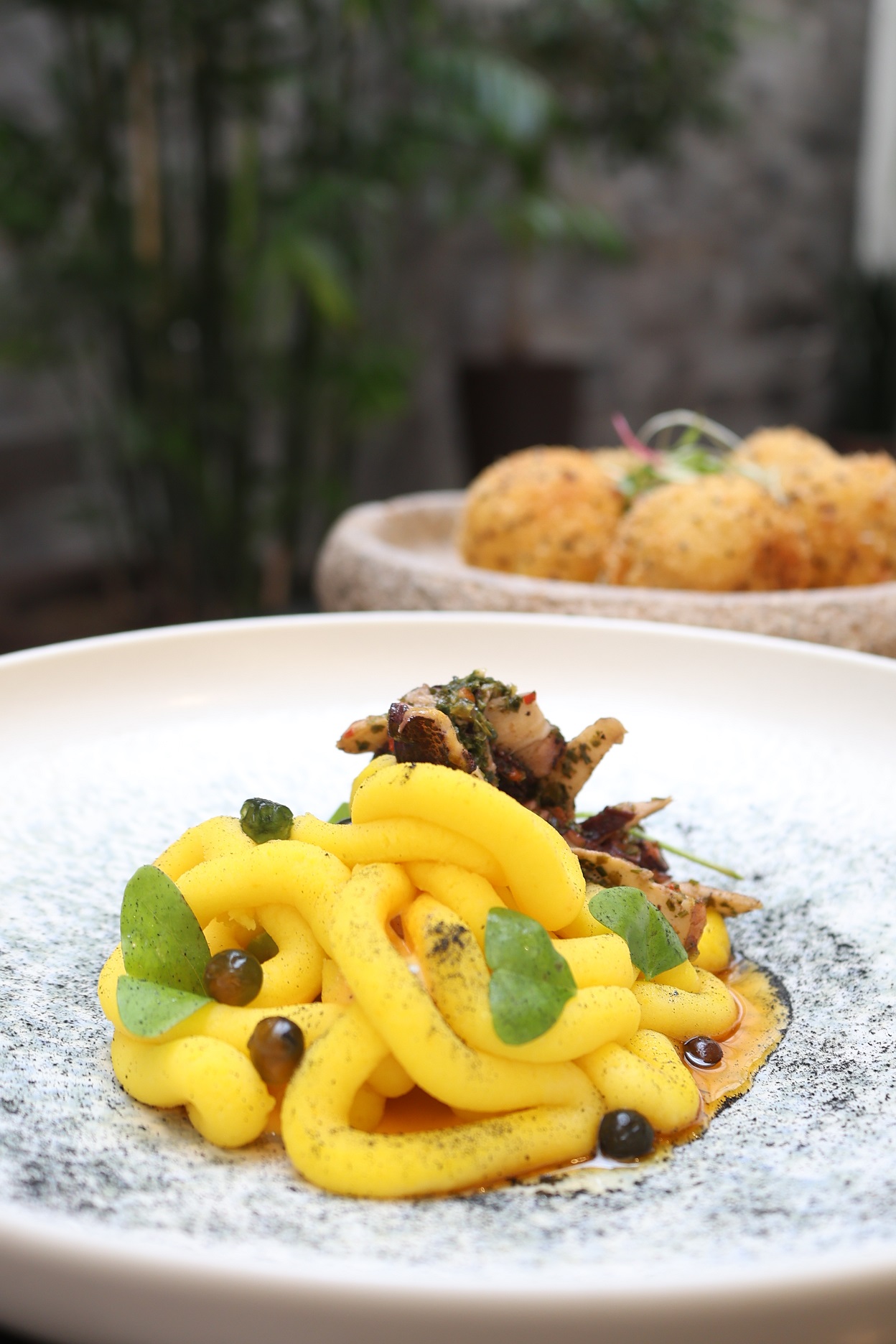 El restaurante es una mezcla de las distintas cocinas de país, con un sabor vanguardista. Desde ceviches y causas reinventadas hasta fondos elaborados con técnicas de alta cocina —como panceta confitada, tataki de atún y osobuco al vino— cada creación está diseñada para ser contemplada, saboreada y recordada. La oferta incluye también sopas tradicionales reinterpretadas, snacks y tapeos peruanos reinventados, postres de inspiración global y una coctelería de autor con insumos andinos, frutas exóticas e ingredientes infusionados.