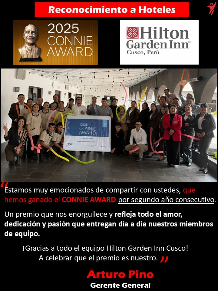Desde oe2 LIDERES by Hotevia felicitamos a Arturo Pino gerente general y Harumi Nemoto gerente de RRHH y todo el equipo del Hilton Garden Inn Cusco por mantener por segundo año consecutivo la hospitalidad peruana en lo más alto al recibir el máximo reconocimiento que otorga Hilton.