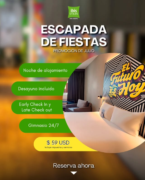 Durante todo el mes de julio el hotel estará promocionando el paquete “28: Viva Perú” que ofrece una noche de alojamiento, desayuno buffet en el restaurante Isidro Bistró Limeño, early check-in y late check-out, uso de gimnasio, piscina temperada, estacionamiento de cortesía y un trago, pisco sour o chilcano.