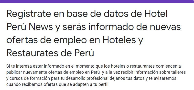 En Hotel Perú News queremos ir por delante y en esta ocasión ofrecer a los profesionales del sector que estén buscando un trabajo, la posibilidad de registrarse en nuestra base de datos para contar con la información de su perfil y en el momento de recibir nuevas ofertas de empleo o ver publicadas ofertas de puestos de algunas de las cadenas que publican en sus paginas corporativas, enviarte un email informándote sobre la oferta de empleo que se adapte a tu perfil.