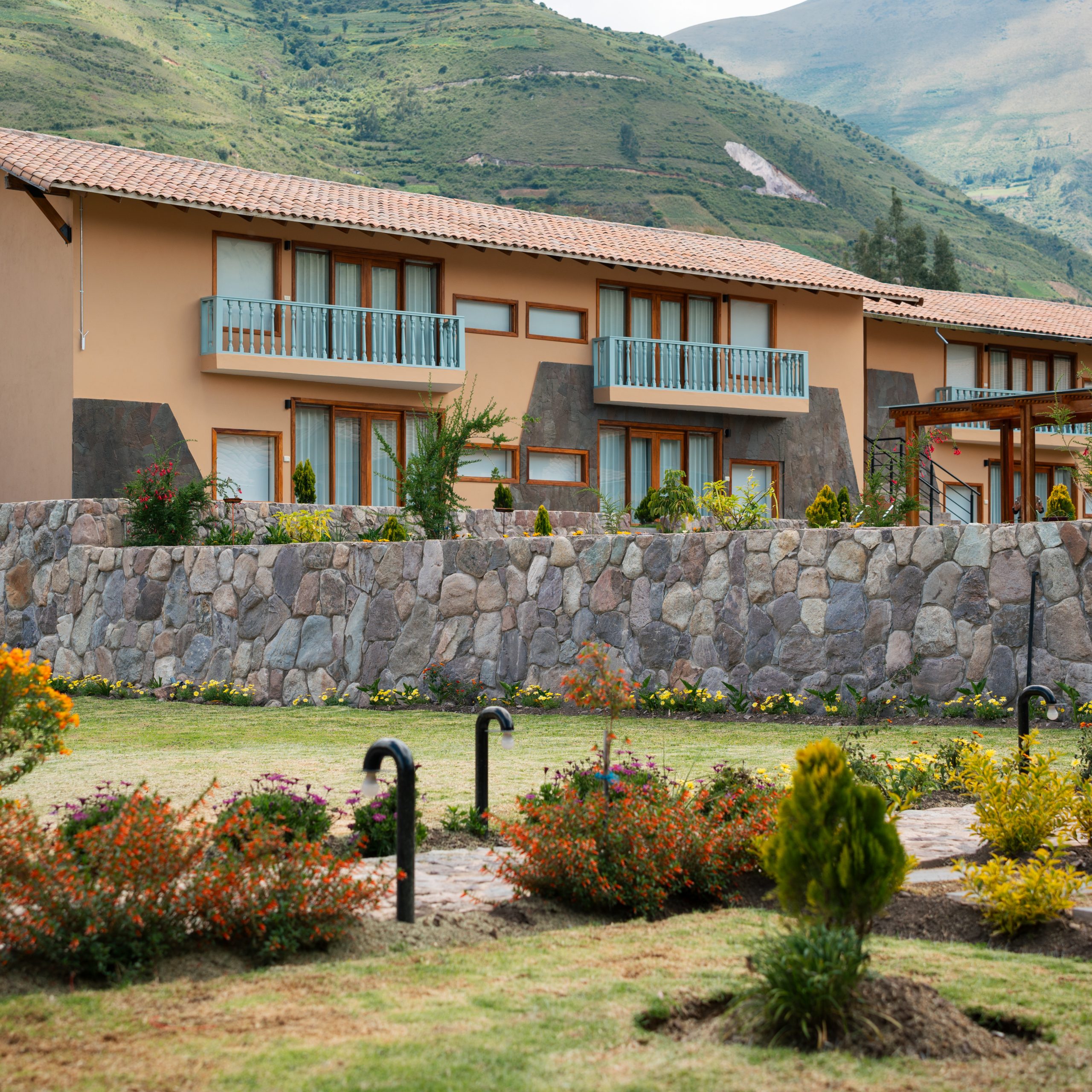 La arquitectura respeta el paisaje andino mediante el uso de materiales como piedra, madera y tonos tierra, generando una integración natural con el entorno.